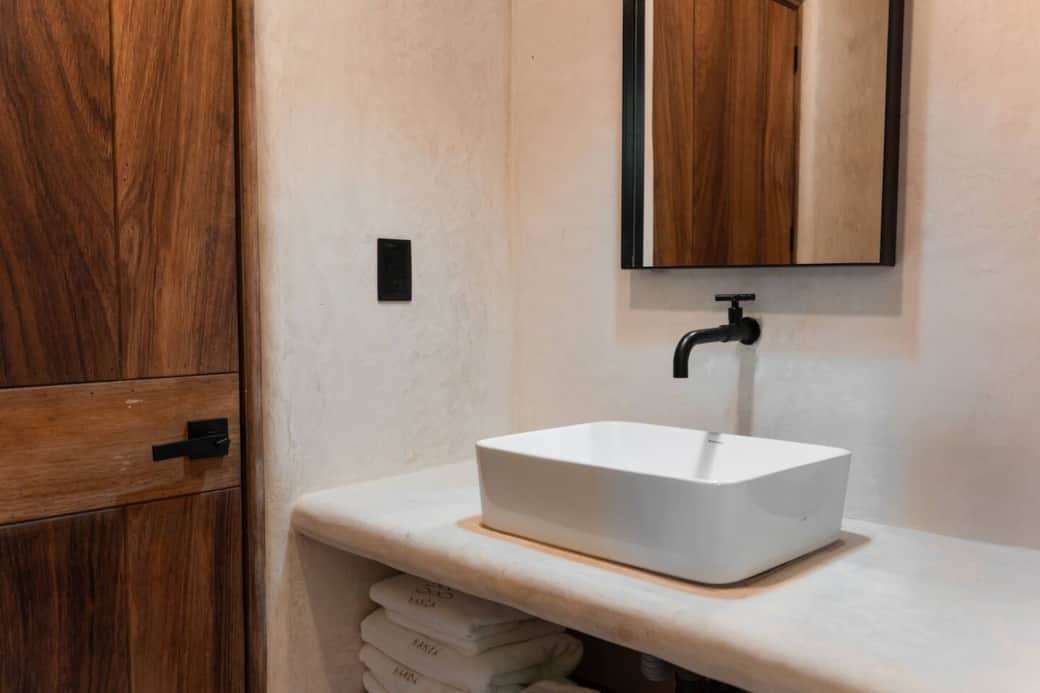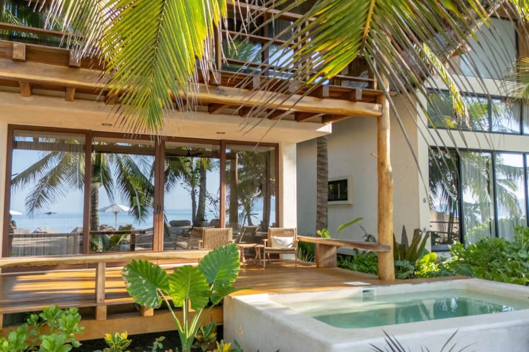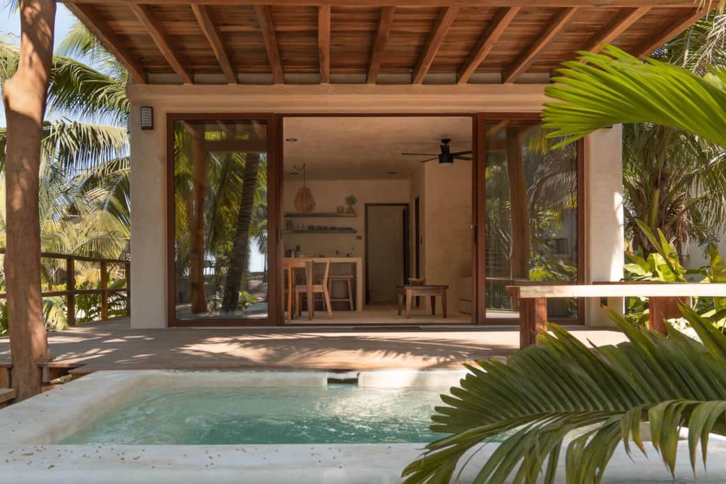 Bungalow frente al mar, justo sobre la arena. Hecho con materiales naturales, cuenta con una recámara con cama king, sofá cama king en la sala y dos baños completos. La cocina y sala se abren a una terraza con deck de madera y alberca privada climatizada con vista al mar, ideal para relajarte.