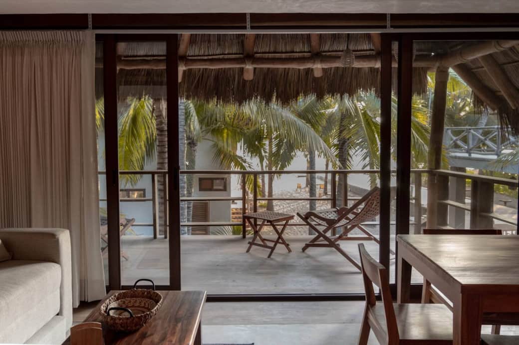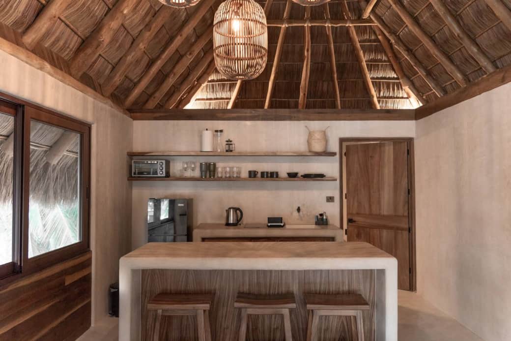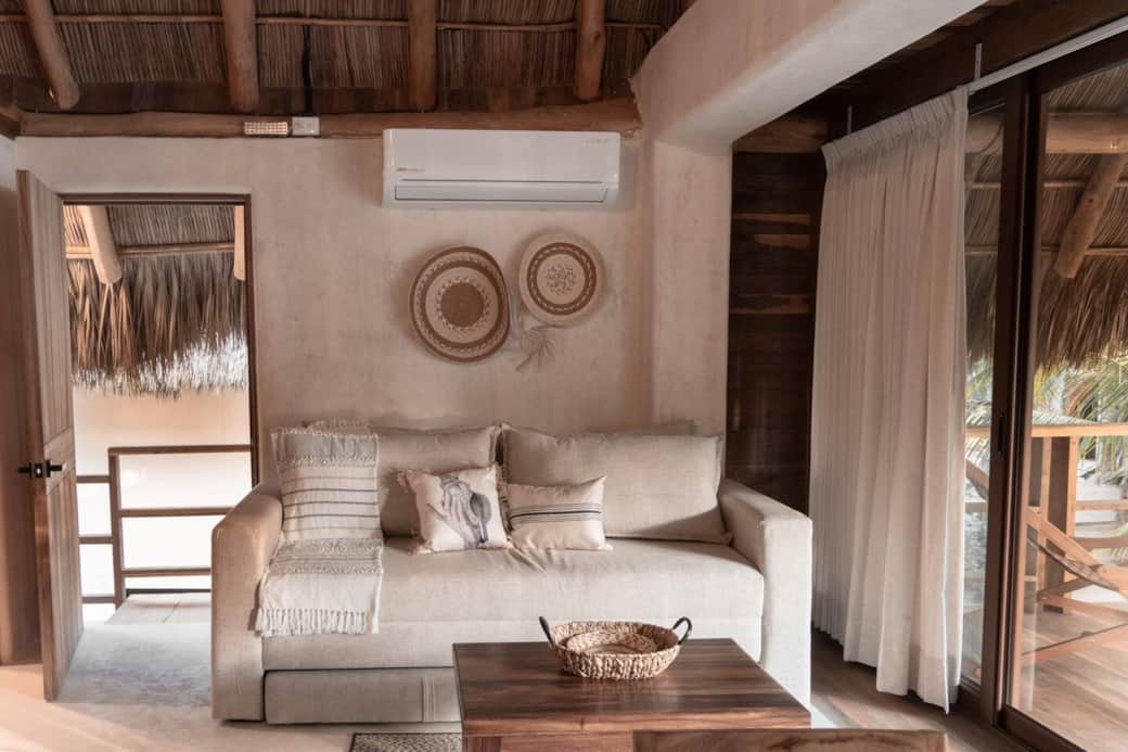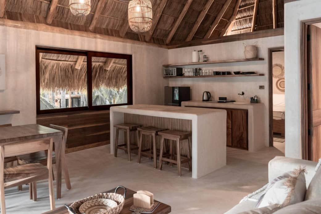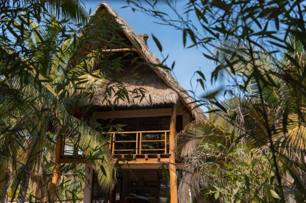 Disfruta este bungalow en planta alta con vistas panorámicas al mar. Hecho con materiales naturales, cuenta con una recámara con cama king, sofá cama king en la sala y dos baños completos. La cocina y sala se abren a una terraza de madera con vista al mar, ideal para relajarte.
